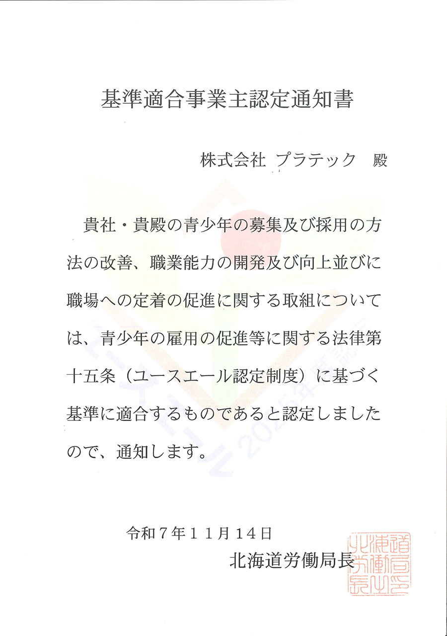 (株)プラテック ユースエール基準適合事業主の適合認定を受けました